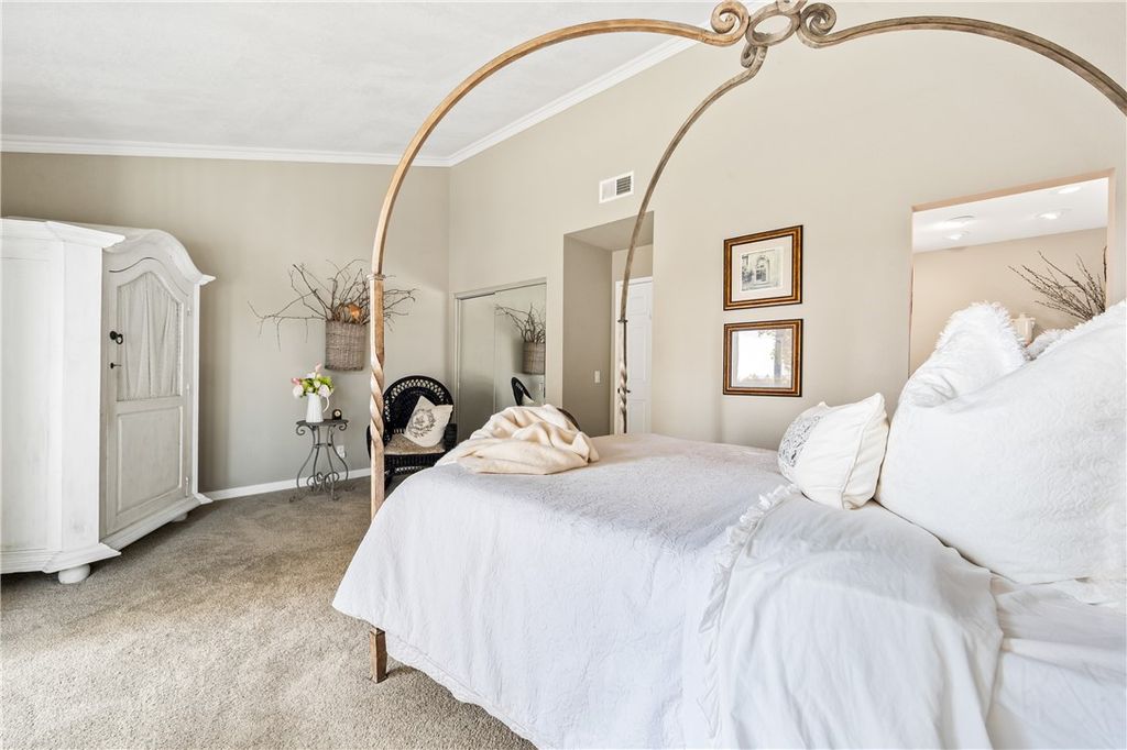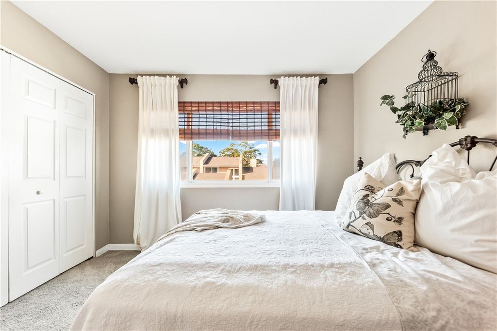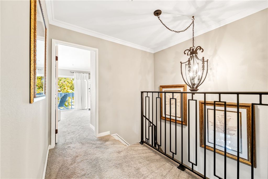 Enter from your two-car garage or the gated courtyard to a relaxing patio and once inside you will immediately feel the care and attention to detail put into this home with expansive high ceilings and exquisite upgrades including hardwood flooring, custom patterned carpet, dual pane windows, custom woven wood shades. Kitchen features custom high-end cabinetry with spindle details and glass-front doors, creating a warm and inviting atmosphere. Kitchen offers a perfect balance of elegance, comfort, and functionality. Upstairs you will find a generously sized bedroom and remodeled hall bathroom with bathtub. Down the hall is the oversized primary bedroom featuring a balcony with views, vaulted ceiling, two generous sized closets and a remodeled bathroom with a claw-foot tub and ample storage.