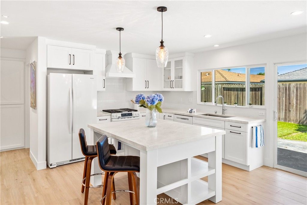 Boutique Hotel Vibes. LOCATION, LOCATION, LOCATION. One and a half miles to the beach, and just a half mile to acclaimed Edison High School. This single-story, 4 bed/2 bath home with 2-car garage is a completely RENOVATED MID-CENTURY GEM on a quiet, interior lot. Professionally designed, light, bright, and magazine-worthy, with new porcelain wood-look floors from Spain, new windows, recessed lighting, and fresh paint throughout. HUGE DREAM KITCHEN (21' x 17') with marble counters, custom island, morning light, and built-in dry bar with wine fridge. Living room features an artisan-created Venetian plaster fireplace. Both bathrooms updated, including custom tile. ALL BRAND NEW APPLIANCES, including washer/dryer (separate indoor laundry room). Backyard features original HAND-PAINTED MURAL by well-known local artist, mature trees, and fire pit. Rare turnkey opportunity- hurry, won't last!